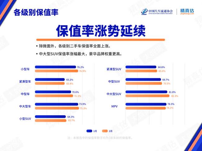 2022年3月,中国汽车流通协会和精真估联合发布了《2022年2月中国汽车保值率研究报告》。报告显示,2月份二手车车源量为74.77万辆,环比1月下降约8万辆。各级别车型保值率则继续保持上涨。