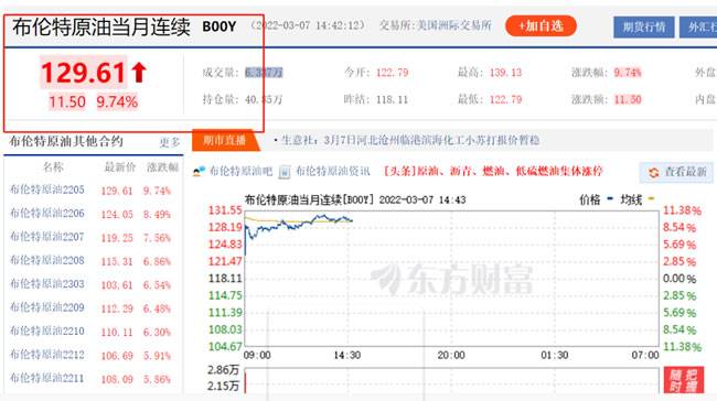 截止到3月7日下午,布伦特原油价格已经突破120美元,一度冲到近140美元,达到129.61美元/桶,涨幅超过9%。