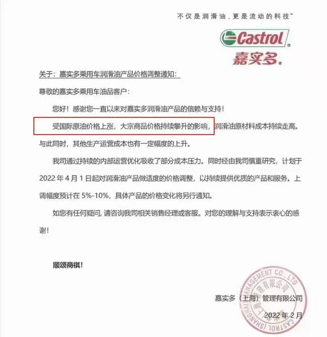 截至目前,已经公开发现了10余家企业的润滑油涨价通知单,包括美孚、嘉实多、壳牌等大品牌。