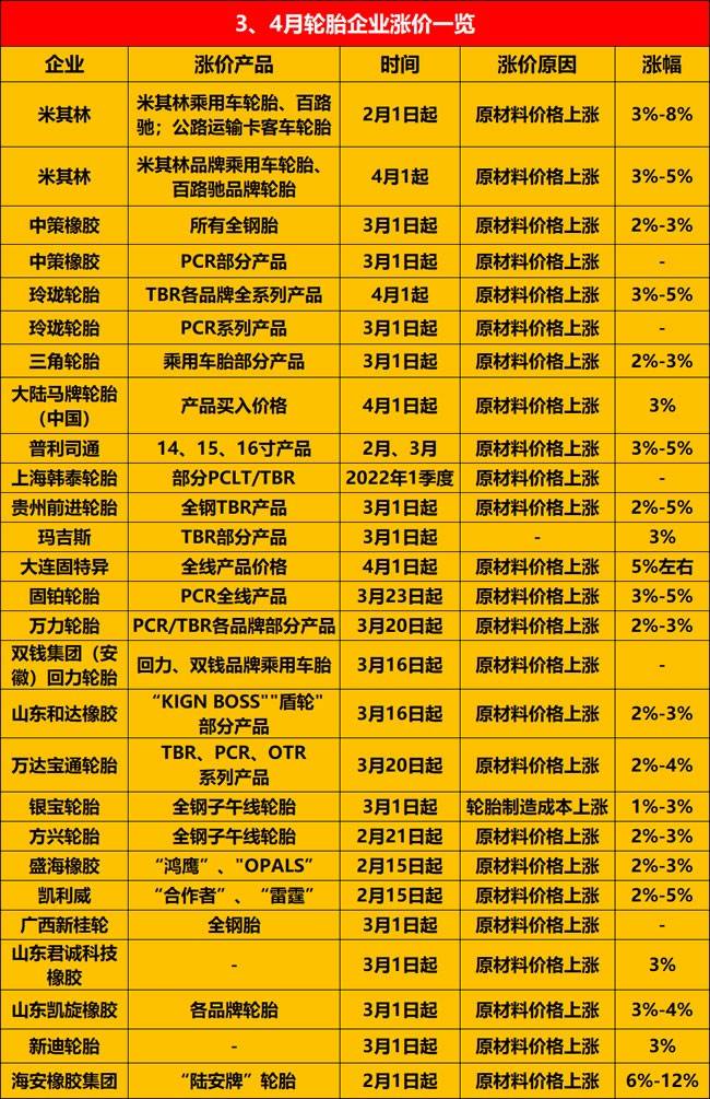 这也就是说,原油涨价也会在一定程度上增加轮胎运输成本,再加上合成橡胶价格的上涨,那么轮胎价格必然会有所波动。目前,已经有近30家轮胎企业宣布3、4月涨价: