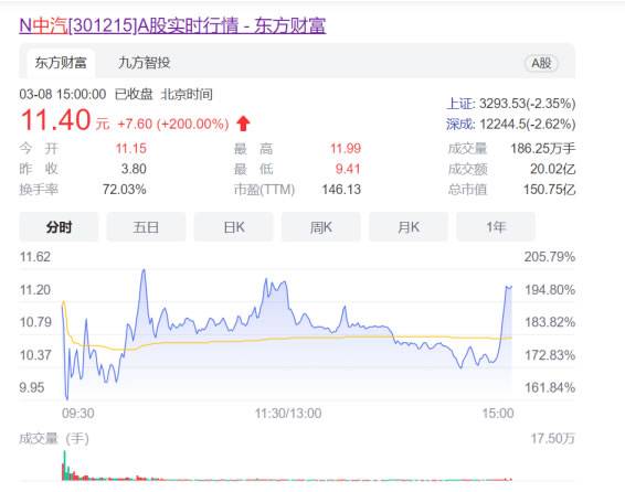 3月8日,中汽研汽车试验场股份有限公司(股票简称:中汽股份,股票代码:301215),正式于深交所创业板上市,成为A股汽车试验场领域第一股。据发行公告,本次IPO,发行价格3.80元/股,市盈率53.6倍,共发行33,060万股,占总股本25%。据发行结果公告,本次实际募集资金总额12.56亿元,超出预计募集资金约67.50%,中汽股份的发展前景受到市场及投资者高度认可。IPO首日,股价报收11.40元,市值达到150.75亿元,涨幅达200%。