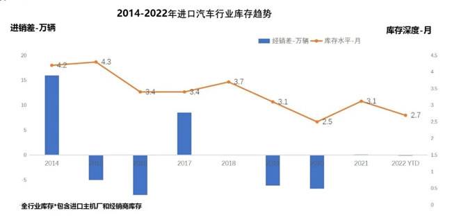 伴随着19-20年供给小于需求,进口汽车全行业库存深度出现明显下滑,2021-2022年供需基本平衡,但销量有所下滑,库存深度回升至2.7个月,从历史来看,处于合理偏低水平。