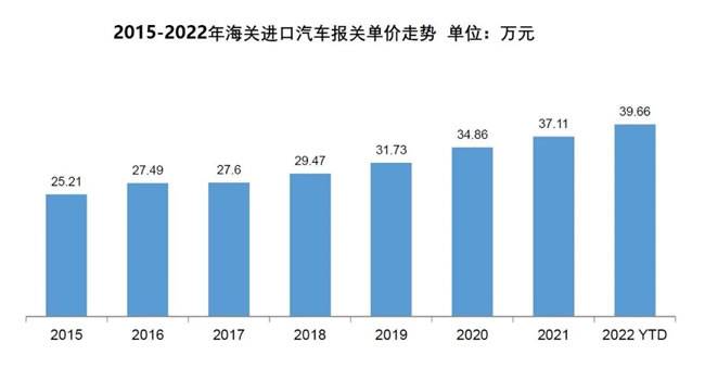 进口汽车报关单价逐年提升,从2015年到2022年,进口汽车报关单价从25.21万元提升到39.66万元,一是消费升级趋势,二是低价产品国产化趋势。