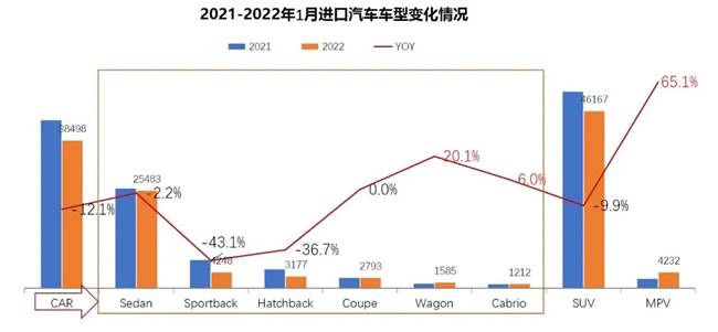 2022年1月,在塞纳带动下,MPV同比增速达到65.1%,轿车和SUV同比出现较大幅度下滑;小众化车型表现好于整体,凸显进口车市场个性化需求,Wagon车型同比增速达到20.1%,Cabrio同比增长6%