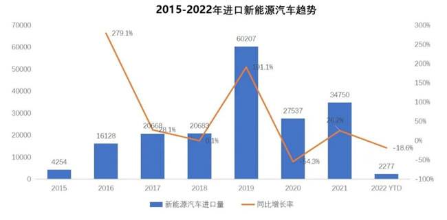 2016-2018年进口新能源汽车销售在1.5-2.0万辆之间,在Model 3的带动下,2019年进口新能源汽车销售暴增至6万辆,同比增长191%,占进口汽车总量的5.4%;随着车型国产,2020年销售规模回落至2.75万辆,随着PHEV的贡献,2021年销售同比增长26.2%,2022年NEV销售2277辆,同比下滑18.6%,主要是由于纯电动下滑39.8%。