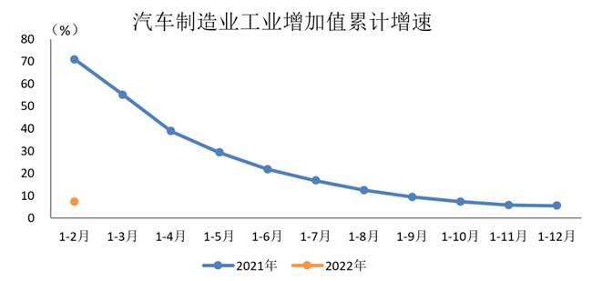 据中国汽车工业协会编辑的国家统计局公布的数据显示,2022年1-2月,汽车制造业工业增加值同比增长7.2%,略低于同期规模以上工业企业工业增加值增速。