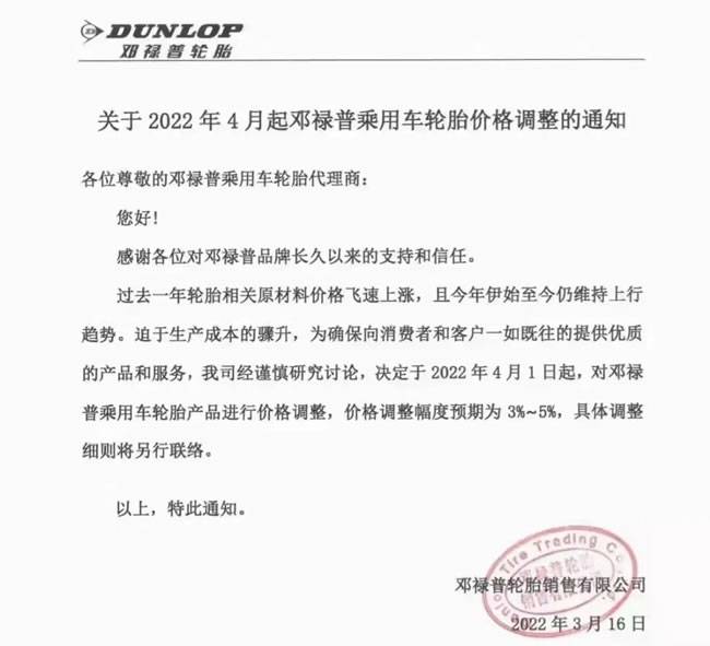 其中,邓禄普决定,4月1日起,对邓禄普乘用车轮胎产品进行价格调整,调整幅度为3%~5%。