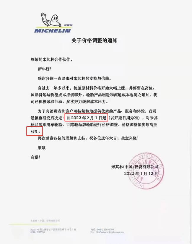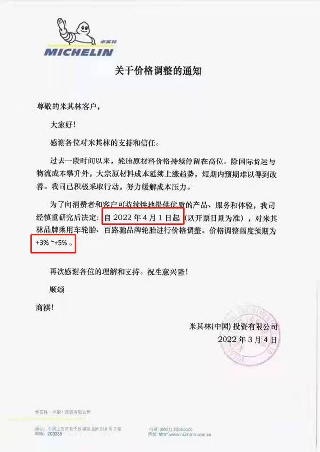 比如,米其林已经实现2轮涨价。米其林曾宣布,2月1日起对乘用车轮胎、百路驰品牌轮胎价格上调3%;随后又宣布4月1日再上调3%~5%。