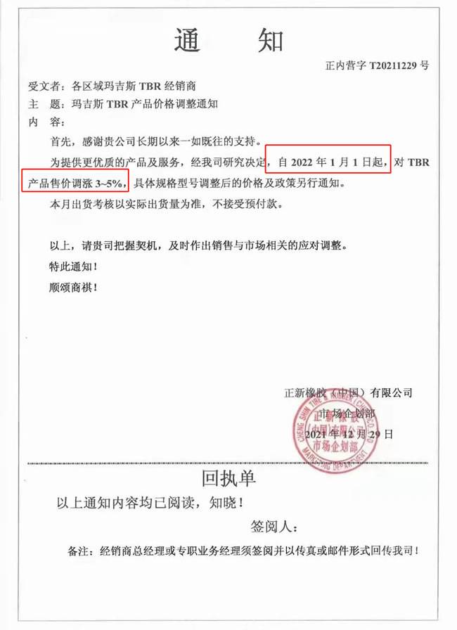 价格调整,主要是由于过去一年轮胎相关原材料价格飞速上涨,且今年依然维持上涨趋势,轮胎制造成本不断增加。