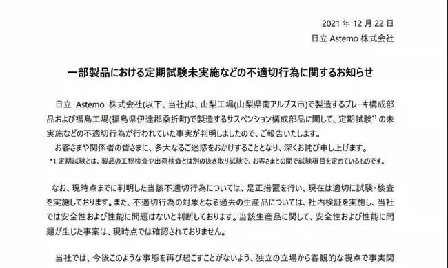 提到汽车刹车片都知道在后市场中,属于是易损件,是汽车最关键的安全零件,近日一则消息引起广泛的关注,21年12月22日,由日立集团控股的零部件公司日立安斯泰莫(Astemo)召开新闻发布会,承认公司在刹车和悬挂系统的试验及检查中,存在未试验及篡改检查数据等造假行为,而这种做法从2000年左右一直延续到今年10月。