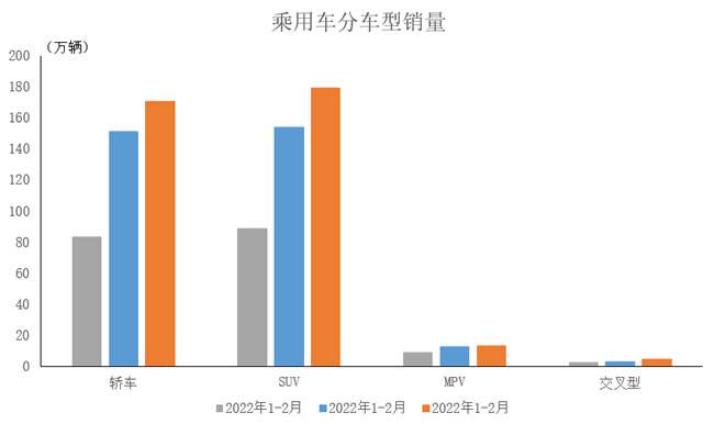 2022年1-2月,在乘用车主要品种中,与上年同期相比,多用途乘用车(MPV)销量增速略低,其他三大类乘用车品种均呈较快增长。