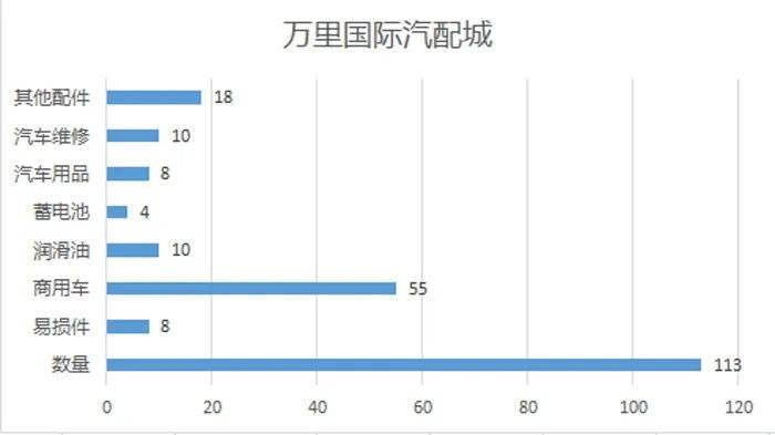 专门做易损件的有18家专门做蓄电池的有5家专门做商用车的有10家专门做润滑油的有5家专门做轮胎的有6家专门做汽车用品的有10家专门做汽修的门店约10家