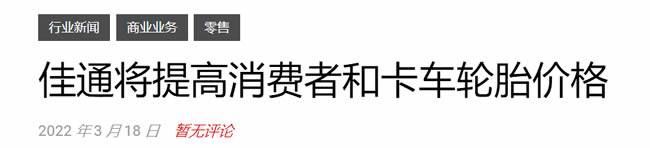 据外媒报道,近日佳通轮胎宣布,将在5月上调美国地区所有乘用车、轻型卡车和卡车客车子午线轮胎的价格,提高8%。