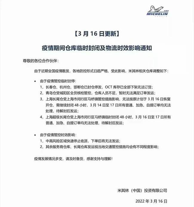 受疫情影响,现在国内面临全国多地轮胎厂停止发货的困境。3月16日,米其林宣布米其林长春仓、杭州仓、邯郸仓已封仓停发;青岛仓暂时无法满足订单发运;上海长尾仓目前无法恢复开仓,加急订单需要解封后发运。