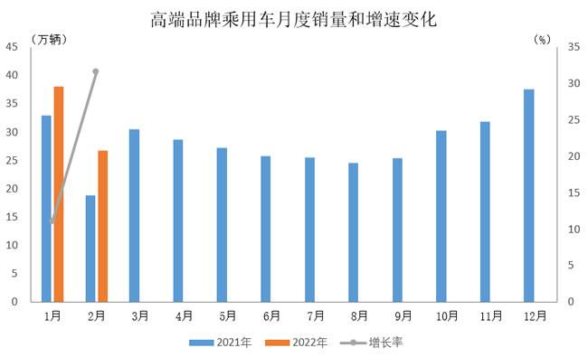 2022年2月,国内生产的高端品牌乘用车销量完成26.8万辆,同比增长31.6%,增幅比1月提升20.5个百分点。2022年1-2月,国内生产的高端品牌乘用车销量完成65.6万辆,同比增长20.0%,高于乘用车总体增速5.6个百分点。