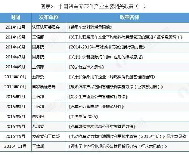 政策频发,行业要求逐步提高。由于每辆汽车需要的汽车零部件达到一万个左右,而这些零部件又涉及到不同的行业和领域,在技术标准、生产方式等方面存在较大的差距。目前,国家对汽车零部件制造业还缺少统一的法律规范以及相关政策,关于汽车零部件制造业相关的政策主要分布于汽车产业的相关国家政策当中。