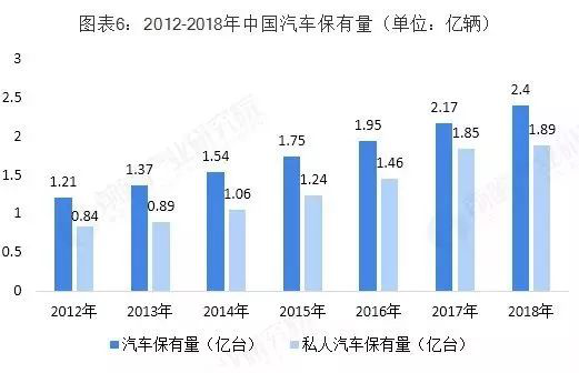 汽车保有量稳步提升。2012-2018年,我国汽车保有量逐年增长,年复合增长率超过12%。2018年底,全国汽车保有量达到2.4亿辆,比2017年增加2285万辆,增长10.51%。从车辆类型看,小型载客汽车保有量达到2.01亿辆,首次突破2亿辆,比2017年底增加2085万辆,增长11.56%,是汽车保有量增长的主要组成部分。