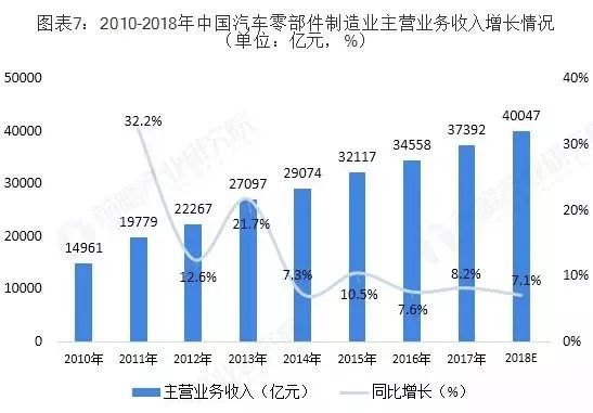 行业主营业务收入不断提高。中国汽车产销量的整体提高为我国新车零部件配套市场的发展提供了发展空间,同时不断增长的汽车保有量下,汽车维修与改装对零部件的需求也在不断增长,促使我国汽车零部件行业不断壮大。根据中汽协数据,2017年,我国汽车零部件制造企业实现销售收入37392亿元,同比增长8.20%。2018年,虽然我国汽车产销量下滑,但是汽车保有量增长下汽车后市场对零部件需求提升,我国汽车零部件市场依然保持稳步增长,销售收入突破4万亿大关,增速约为7.1%。