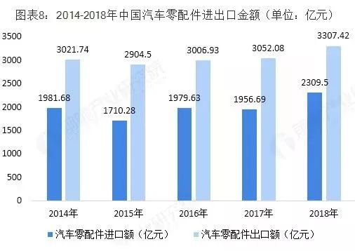 汽车零配件进出口金额呈扩大趋势。中国汽车零部件行业的稳步发展之下,我国汽车零配件的进出口得到良好发展。根据海关总署数据显示,2015年受到全球经济低迷与传统出口市场萎缩的影响,我国汽车零配件进出口金额有所下滑;2018年虽然受到中美贸易摩擦的影响,但是中国汽车零配件保持了稳步增长,进口金额为2309.5亿元,出口金额为3307.42亿元,贸易顺差为1318.2亿元。2016-2018年,我国汽车零配件保持良好发展趋势,长期处于贸易顺差状态。