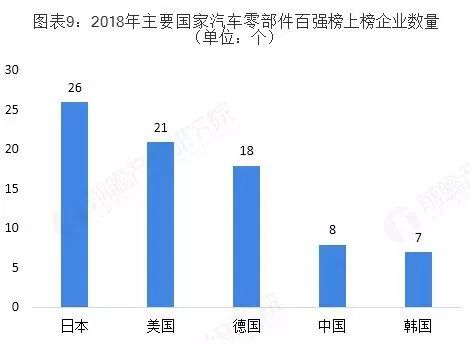 中国零部件企业整体落后于西方。2018年6月,《美国汽车新闻》(Automotive News)在普华永道支持下发布了2018全球汽车零部件配套供应商百强榜,榜单显示,日本26家汽车零部件汽车上榜,排名第一;美国第二,有21家企业入榜;德国以18家上榜企业位列第三。中国上榜企业有8家,高于第五名的韩国。但是中国8家(包含被国内企业收购的耐世特和普瑞)上榜企业2017年营业收入共计327.32亿美元,低于韩国上榜企业的515.44亿美元。整体来看,我国汽车零部件企业虽然上榜数量排在全球前列,但是企业平均营收规模较低,中国汽车零部件企业与发达国家仍有较为明显的差距。