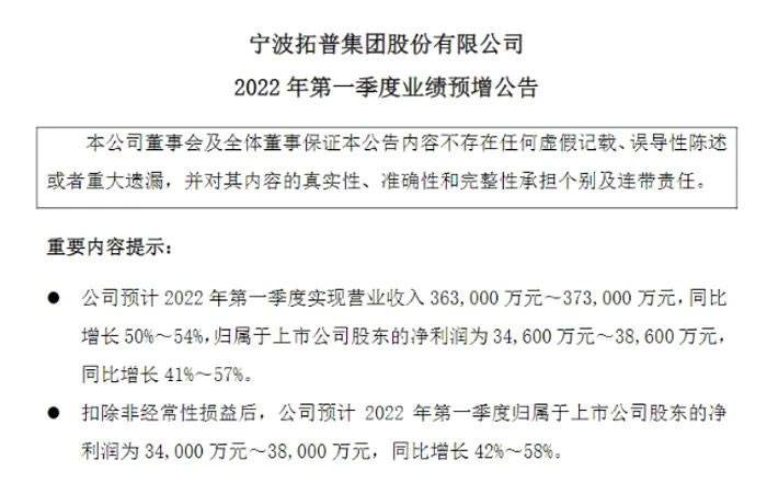 3月29日,宁波拓普集团股份有限公司(以下简称“拓普集团”)发布2022年第一季度业绩预增公告,公司预计2022年第一季度实现营业收入363,000万元-373,000万元,同比增长50%-54%,归属于上市公司股东的净利润为34,600万元-38,600万元,同比增长41%-57%。扣除非经常性损益后,公司预计2022年第一季度归属于上市公司股东的净利润为34,000万元-38,000万元,同比增长42%-58%。