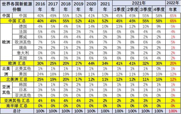 2021年全年的欧洲新能源市场受疫情影响,新能源增长较强。2022年仍旧受到疫情影响,2022年较2021年份额下降较大。近期中国新能源乘用车的增速弱于世界平均增长速度,2020年中国新能源乘用车世界份额较大反转,一季度低迷,二季度反转,下半年暴涨,2021年全年保持较强。2022年一季度的份额达到20%。