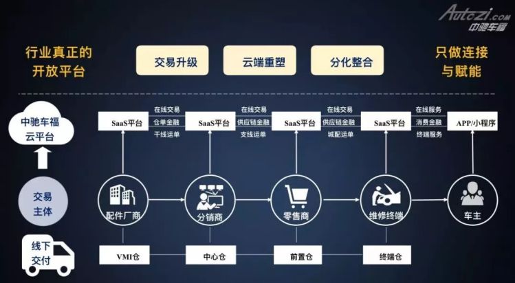 中驰车福秉承“开放•连接•赋能”的核心理念,退出配件自营交易,面向全行业开放合作,不与行业主体抢食;将配件厂商、配件经销商、维修终端、仓储企业、物流企业、整车商、保险企业、金融企业、以及运营车平台、租赁公司、私家车等产业链上各个交易主体,连接互联网云平台上,开展配件分销服务、配件零售服务和车主服务;即时将产业链上各交易主体上下游之间产生交易的信息流、资金流和物流实现在线化、数字化和智能化,这是对今天基于电信网络通过语音、文本和图片传输的交易方式,向未来基于“在线化、数字化和智能化”交易的一场巨大变革,也是人类历史上商品交易的第三次革命。