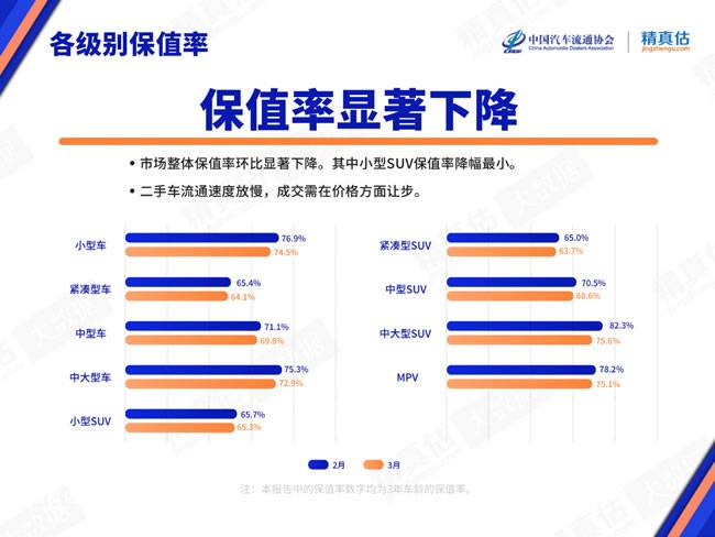 交易淡季叠加疫情等多个不利因素,导致二手车的流通速度已经显著减缓。背负库存压力的车商需要降价的手段促成交。本月二手车降价是普遍性的,在品牌和车型偏好上没有显著的特征。小型SUV保值率降幅最小,这一类别因此成为了经营风险最小的品类,价格长期维持稳定。