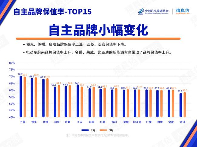 相对于合资品牌,自主品牌汽车保值率大多呈现持平或略有上涨,如领克、传祺、启辰、哈弗、荣威、比亚迪等。尤其是荣威、名爵、比亚迪新能源车辆占比较大的品牌3月保值率上涨明显。传祺旗下GS8新款的上市,持续带动本品关注,带来保值率提升。五菱和长安3月保值率有明显下降。