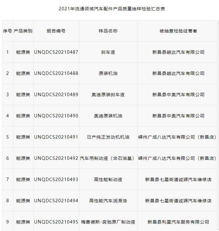 2022年4月11日,浙江省新昌县人民政府网站发布新昌县市场监督管理局2021年流通领域汽车配件类商品质量抽检信息公示。本次对汽车配件类商品质量进行了质量抽检,共抽查了汽车配件类商品19批次,经检验,合格19批次,合格率100%。