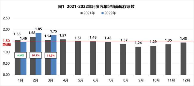 2022年4月10日,中国汽车流通协会发布2022年3月份“汽车经销商库存”调查结果:3月份汽车经销商综合库存系数为1.75,环比下降5.4%,同比上升13.6%。3月,多点疫情波及面广,汽车市场整体遇冷。销量下滑和季末补库导致经销商库存水平较往年显著回升,库存水平位于警戒线以上。
