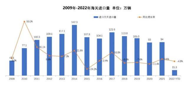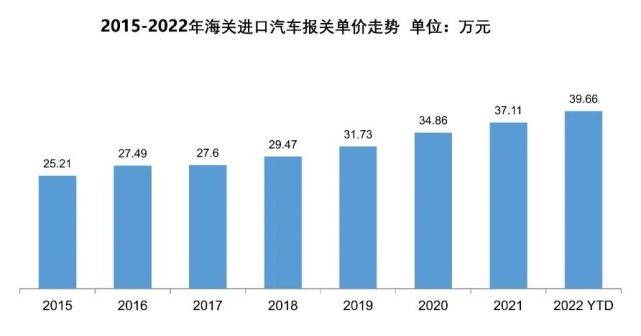 进口汽车报关单价逐年提升,从2015年到2022年,进口汽车报关单价从25.21万元提升到39.66万元,一是消费升级趋势,二是低价产品国产化趋势。