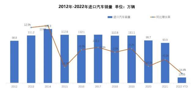 近年来,进口车终端需求保持相对稳定,受疫情和芯片短期冲击,2020年进口汽车市场开始出现下滑,2022年1月销售13.05万辆,同比下降14.4%