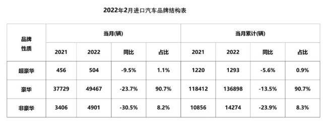 进口汽车消费升级趋势明显,2月所有档次品牌均出现下滑,超豪华品牌下滑幅度明显低于豪华和非豪华品牌,1-2月累计来看,豪华车占比超过91%。
