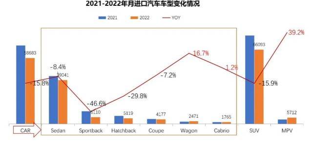2022年1-2月,在塞纳带动下,MPV同比增速达到39.2%,轿车和SUV同比出现较大幅度下滑;小众化车型表现好于整体,凸显进口车市场个性化需求,Wagon车型同比增速达到16.7%,Cabrio同比增长1.2%