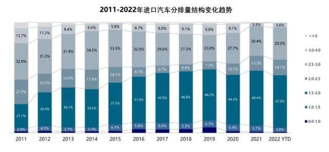 1.5-2.0L排量区间占比为47.5%,相比2021年有所下滑,但仍保持第一大排量区间;平行进口车型逐步恢复供应,3.0L以上排量份额反弹至4.5%,较2021年提升0.6个百分点。