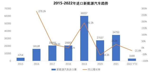 2016-2018年进口新能源汽车销售在1.5-2.0万辆之间,在Model 3的带动下,2019年进口新能源汽车销售暴增至6万辆,同比增长191%,占进口汽车总量的5.4%;随着车型国产,2020年销售规模回落至2.75万辆,随着PHEV的贡献,2021年销售同比增长26.2%,2022年NEV销售3168辆,同比下滑21.6%,主要是由于纯电动下滑37.1%。