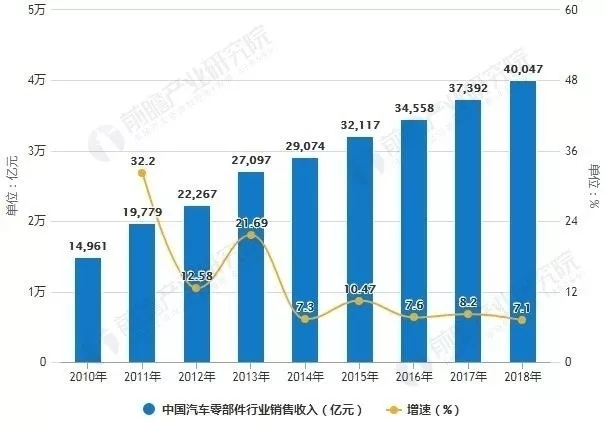 2010-2018年中国汽车零部件行业销售收入统计及增长情况预测