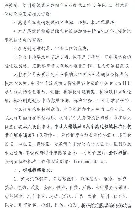 1、标准化专家:填写《汽车售后零部件领域标准化技术专家申请表》(见附件一,单位推荐应加盖单位公章),连同身份证、毕业证、职称证、专家简介中涉及的相关证书、证明以及专业资质、享受政府特殊津贴等证书、二寸彩色照片,全部扫描,报送至中国汽车流通协会售后零部件分会工作邮箱cadap123@qq.com。