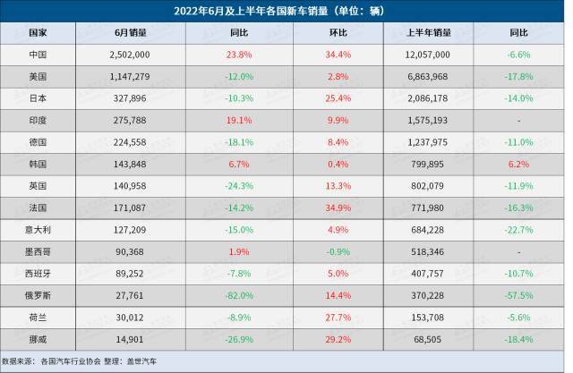 纵观全球车市,6月份,中国、韩国、印度和墨西哥的汽车销量实现了同比增长,其余车市的销量状况并不乐观。此外,由于新冠疫情蔓延和供应链受限等不利因素的影响,全球车市上半年的销量普遍下跌,但中国车市的销量仍突破一千万辆,同比仅下跌6.6%。中国车市未来很有可能恢复增长,但美国和欧洲各国恐怕难以挽回跌势。