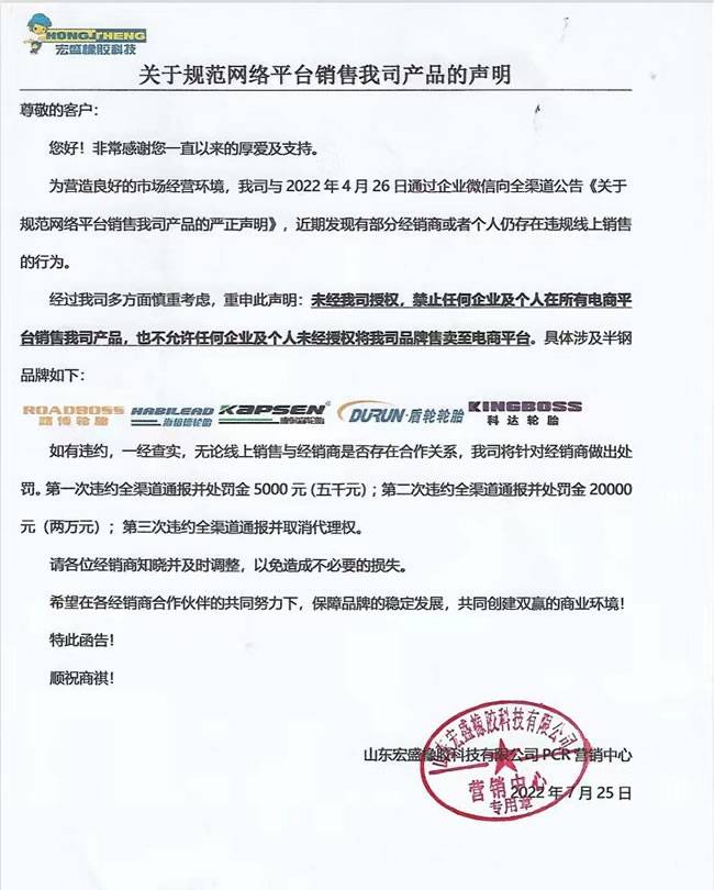 公告表示,宏盛橡胶已然于2022年4月26日,通过企业微信向全渠道公告过一次将规范网络平台销售,但近期仍存在违规线上销售的行为。