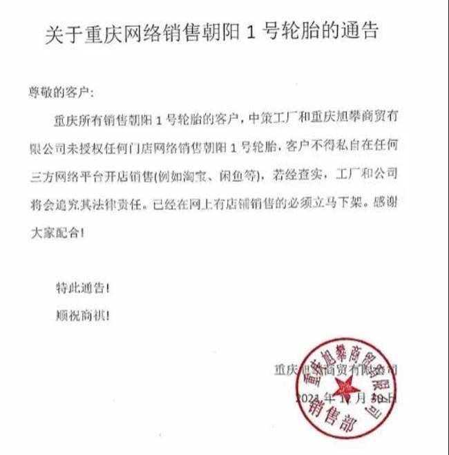 早于去年12月30日,重庆旭攀商贸发布关于重庆网络销售朝阳1号轮胎的通告。