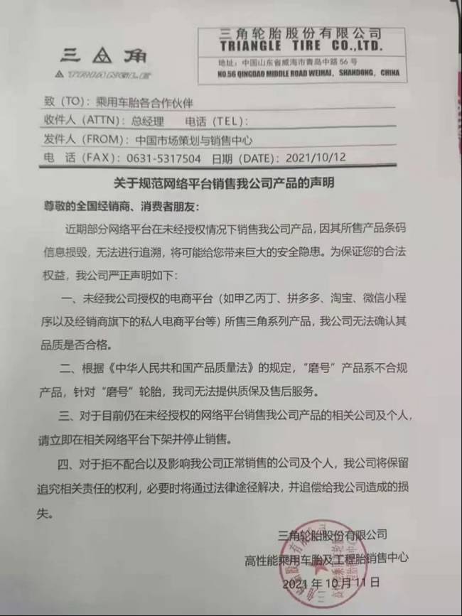 于江苏通用同日,三角轮胎也发布了公告表示,未经授权的甲乙丙丁、拼多多、淘宝、微信小程序、经销商的私人电商平台等所售的三角轮胎,无法确认其品质是否合格,对于销售磨号胎,三角轮胎将无法提供质保和售后。