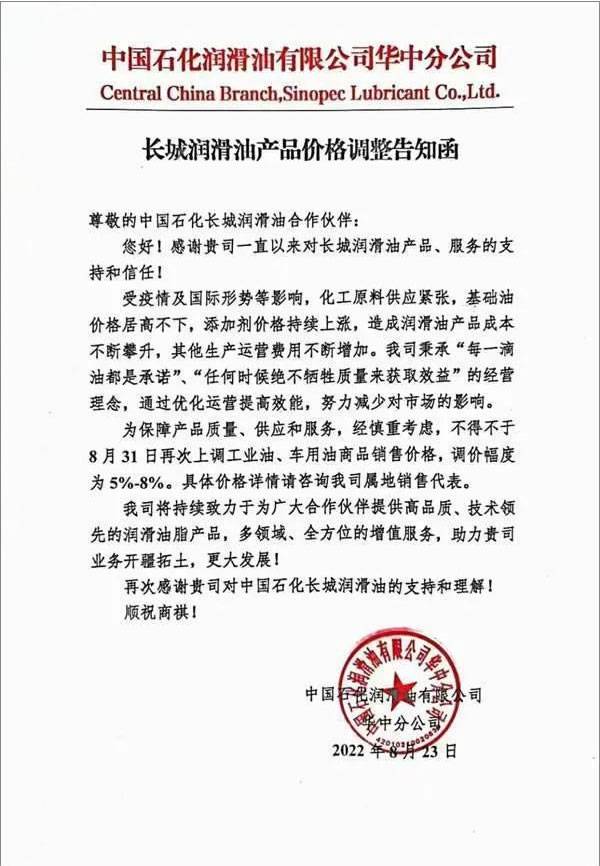 【长城润滑油发布公告:自8月31日起产品价格将上涨5%-8%】