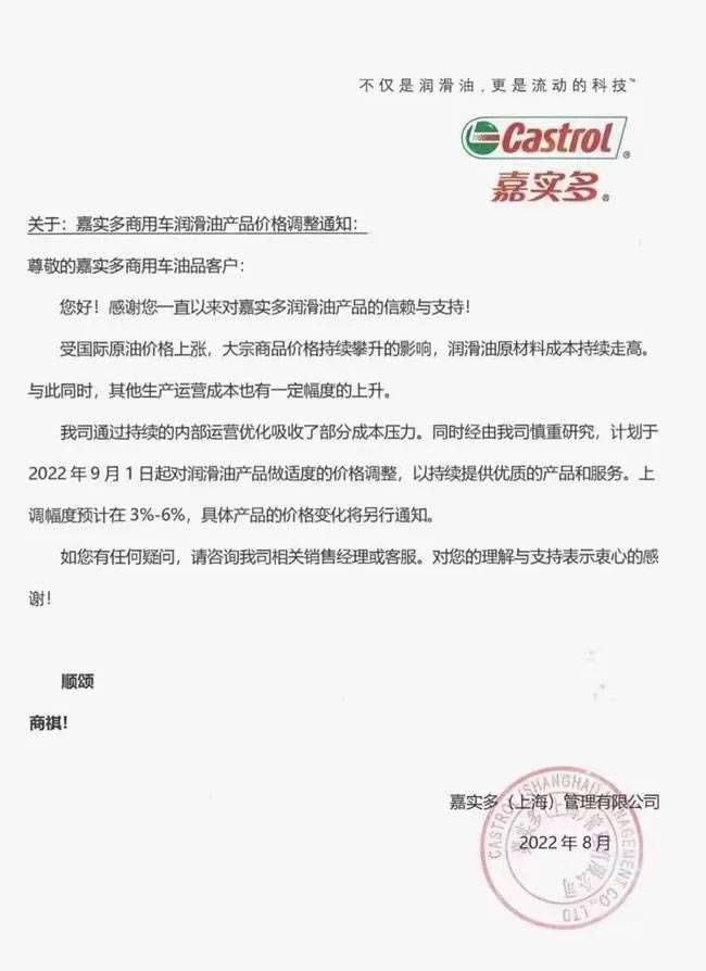 8月24日,嘉实多(上海)管理有限公司发布公告,自2022年9月1日起,嘉实多商用车润滑油产品价格将做出调整,预计平均涨幅3%-6%。