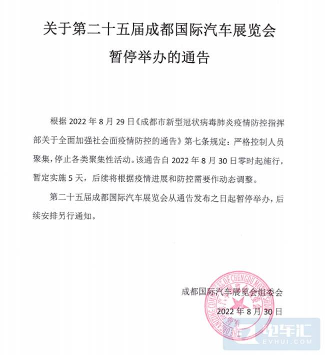 8月30日,成都国际汽车展览会组委会发布关于第二十五届成都国际汽车展览会暂停举办的通告,具体如下: