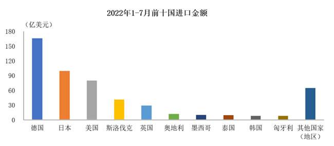 据中国汽车工业协会整理的海关总署数据显示,2022年1-7月,我国汽车商品进口金额排名前十位国家依次是德国、日本、美国、斯洛伐克、英国、奥地利、墨西哥、泰国、韩国和匈牙利。