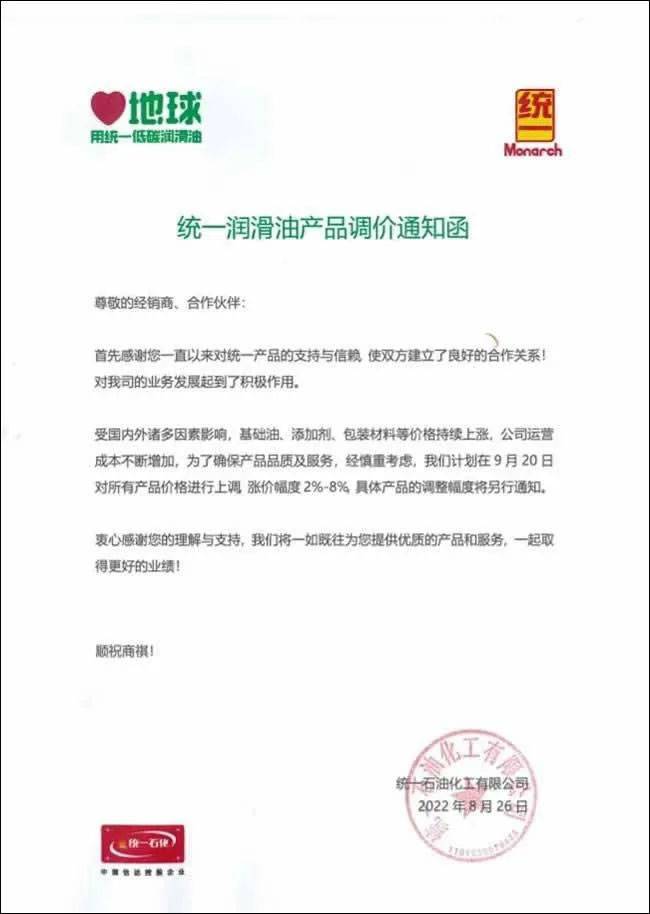 近日,统一石油化工有限公司发布公告,由于受国内外诸多因素影响,基础油、添加剂、包装材料等价格持续上涨等原因,自2022年9月20日起,统一润滑油所有产品价格将做出调整,预计平均涨幅2%-8%。