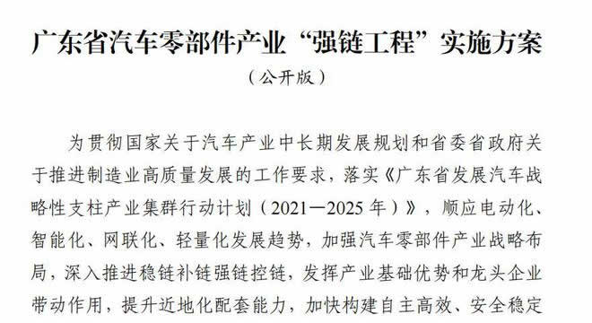 近日,广东省工信厅发布《广东省汽车零部件产业“强链工程”实施方案 (公开版)》,提到2025年发展目标:汽车产量突破430万辆,实现汽车制造业营收超1.25万亿元;零部件制造业营收超5900亿元,“整零比”达到1:0.9。