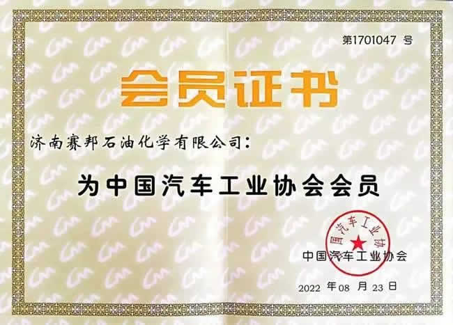 经中国汽车工业协会批准:济南赛邦石油化学有限公司成为中国汽车工业协会会员单位。并获颁会员单位证书。